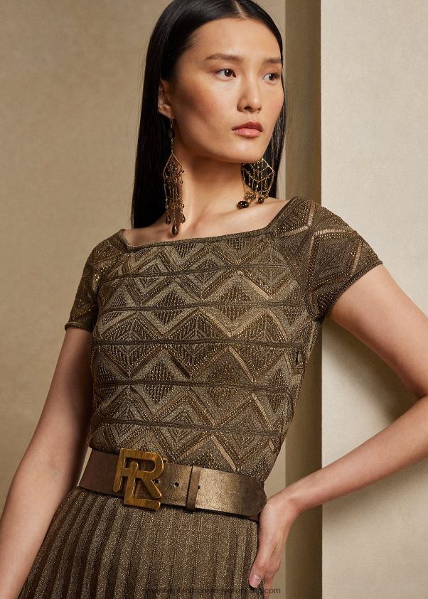 A 2023-as tavasz előtti kollekció fémes történetéhez kapcsolódva ez a rövid ujjú pulóverruha egy innovatív házi különleges gyártásból készült. külsején magasfényű fémes fonallal, hátoldalán izzószálas selyem felhasználásával ezt a kétarcú ruhát redős szoknyával és testhezálló melltartóval tervezték, amelyet arany tónusú gyöngyökkel díszített geometrikus öltésekkel emeltek ki, így ez a stílus megfelelő. nappali vagy esti viseletre.