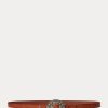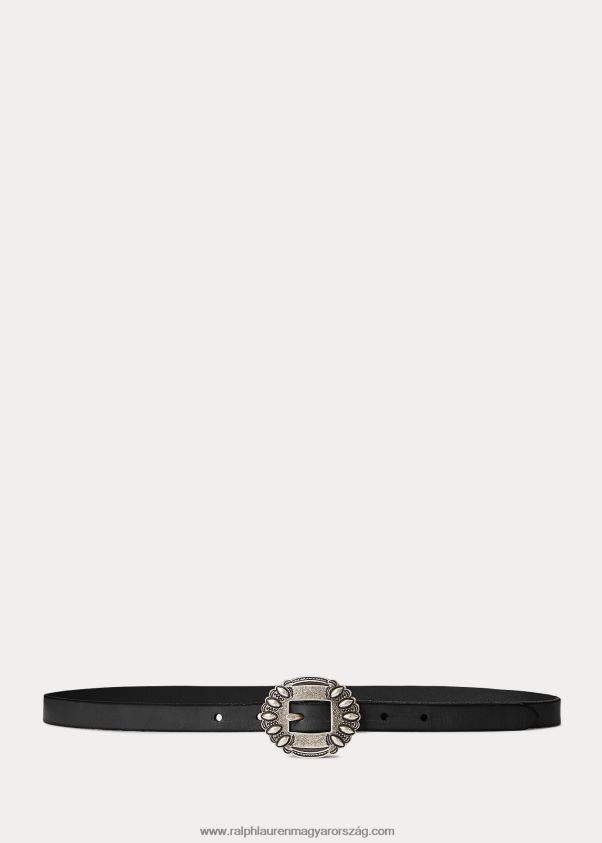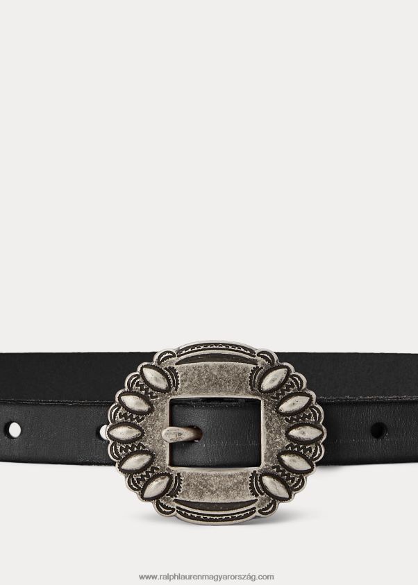 Ralph Lauren amerikai nyugat iránti szerelmét közvetíti ez a vékony öv, amely üvegezett, teljes szemű borjúbőrből készült, és egy bonyolultan gravírozott ezüst tónusú csattal készült.