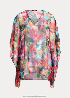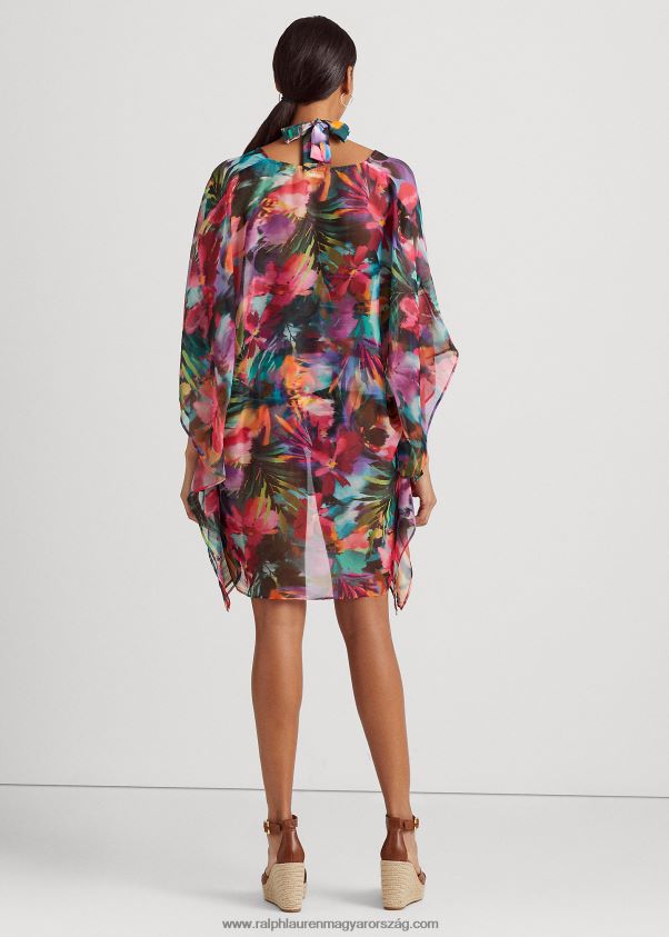 ezt a légies burkolatot a mély V-nyak, a folyékony tunika sziluett és a szezon trópusi virágmotívuma határozza meg.