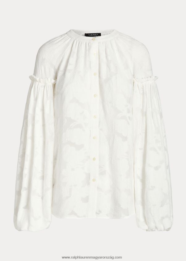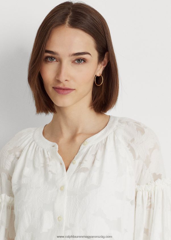 A kifinomult ingek romantikus megjelenése, ezt a stílust a félig áttetsző virágos jacquard szövet és a hullámzó blúz ujjak határozzák meg. lazán illeszkedő sziluettre vágott, „lauren ralph lauren” gravírozású gombokkal van díszítve a jellegzetes stílus érdekében.