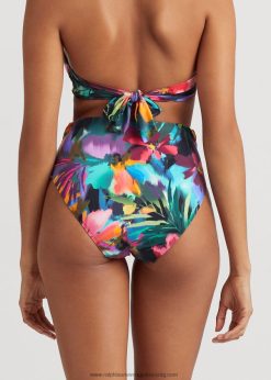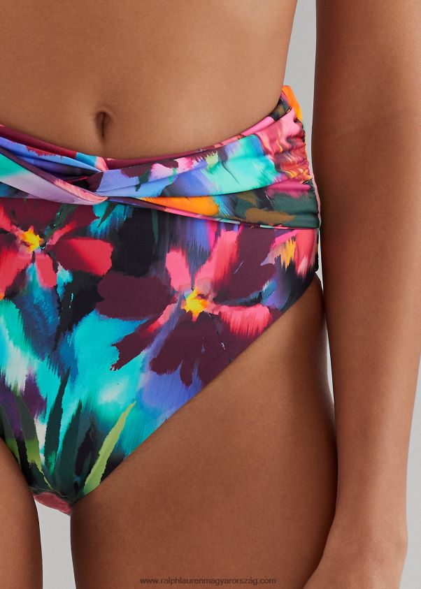A hízelgő, magas derekú sziluetthez vágott, elegáns bikini alsót a szezon trópusi virágmotívuma és egy csavart elülső akcentus emeli ki.