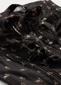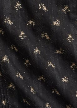 Ujjatlan blúz könnyű áttetsző pamut jacquardból. a virágmintát egy 19. század végi ruhadarab ihlette. pántos gallérral és nyakban önkötővel tervezték. részletezett, fodrokkal a zsinórnál és tűszúrással elöl és hátul. valódi gyöngyház gombokkal lett kiegészítve.